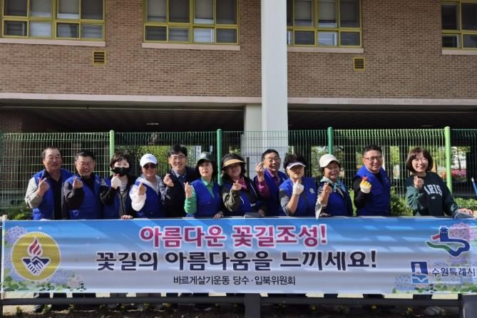 [경기탑뉴스=박봉석 기자] 수원시 권선구 입북동 및 당수동 바르게살기운동위원회는 지난 27일, 당수초등학교 인근 도로변 화단에서 꽃길 가꾸기 환경정화 활동을 펼쳤다.