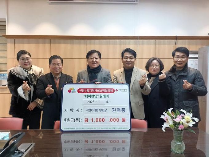 이에 정택진 신장1동장은 “2022년부터 4년째 매년 성금 기탁을 지원해 주시는 권혁중 위원님께 깊은 감사를 드리며, 지원해 주신 후원금은 소외계층 발굴 및 지원을 위한 복지사업에 투명하게 잘 사용하겠다”고 말했다.