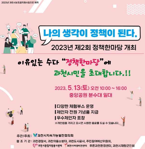 [경기탑뉴스=박봉석 기자] 과천시는 오는 13일 중앙공원 분수대 일원에서 ‘제2회 정책한마당’ 행사를 열고, 시민의 다양한 정책 아이디어를 듣는다.