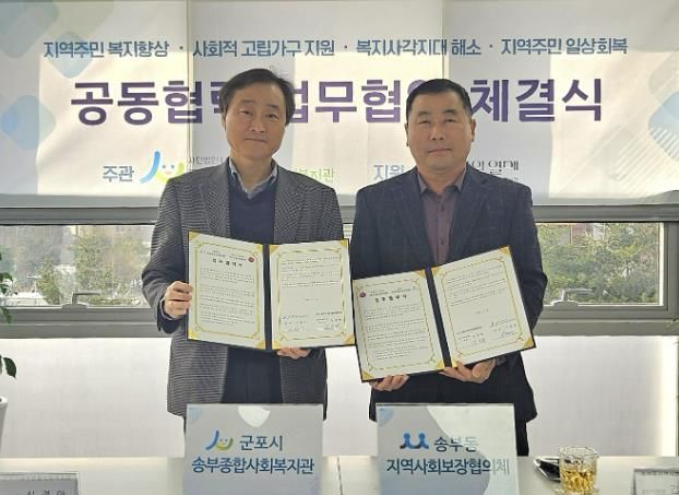 [경기탑뉴스=박봉석 기자] 군포시 송부동 지역사회보장협의체와 군포시 송부종합사회복지관이 3월 17일 관내 지역주민의 복지 향상 및 사회적 고립가구 지원 협력체계 구축을 위한 업무협약을 체결했다.