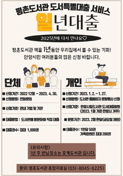 ‘일년대출’은 평촌도서관 소장도서를 1년간 대출해 주는 서비스로, 단체(기업 및 기관)와 개인(안양시민)을 대상으로 실시한다.