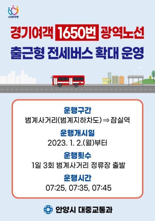 안양시는 국토부, 경기도 및 서울특별시, 성남시, 의왕시, 구리시 등 경유 지자체들과 협의 끝에 오는 2023년 1월 2일부터 1650번 노선에 출근시간 전세버스를 1대를 증차 운영한다고 29일 밝혔다.