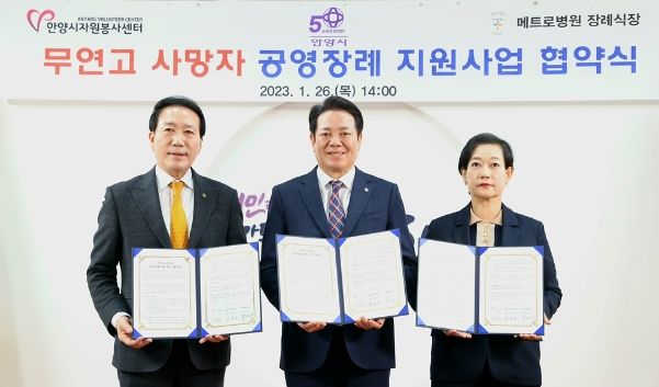 안양시는 26일 메트로병원 장례식장, 안양시자원봉사센터와 ‘안양시 무연고 사망자 공영장례지원 업무협약’을 체결했다. 이 자리에는 최대호 안양시장을 비롯한 시 관계 공무원, 박양숙 안양시자원봉사센터 소장, 박귀종 메트로병원 장례식장 대표이사 등이 참석했다.