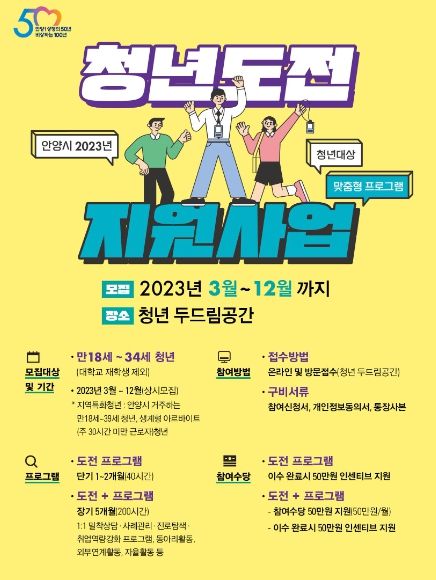 [경기탑뉴스=박봉석 기자] 안양시가 구직단념 청년들이 구직의욕을 갖고 노동시장에 참여할 수 있도록 상담 및 맞춤형 프로그램을 지원하는 ‘청년도전 지원사업’ 참여자를 모집한다고 27일 밝혔다.