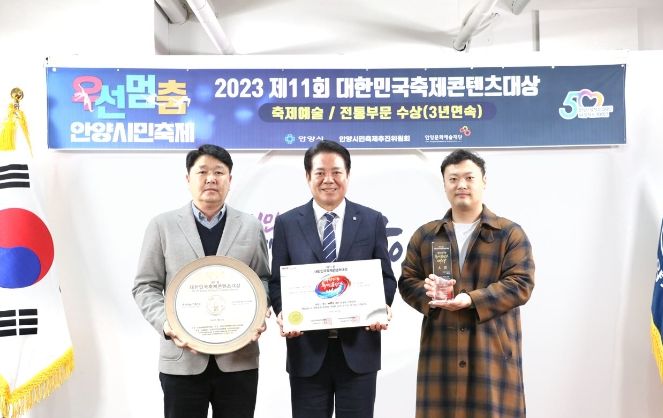 안양시는 지난 2일 안양시청 3층 접견실에서 우선멈춤 대한민국축제콘텐츠대상 수상 전수식을 가졌다고 3일 밝혔다.