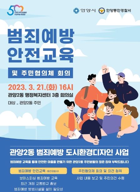 교육에서는 보이스피싱 예방, 최근 개정된 교통법규, 범죄예방 방범시설물 설치 필요성 등에 대한 교육이 이뤄질 예정이며, 사업 주민협의체 뿐 아니라 관양2동 주민이라면 누구나 참석할 수 있다.