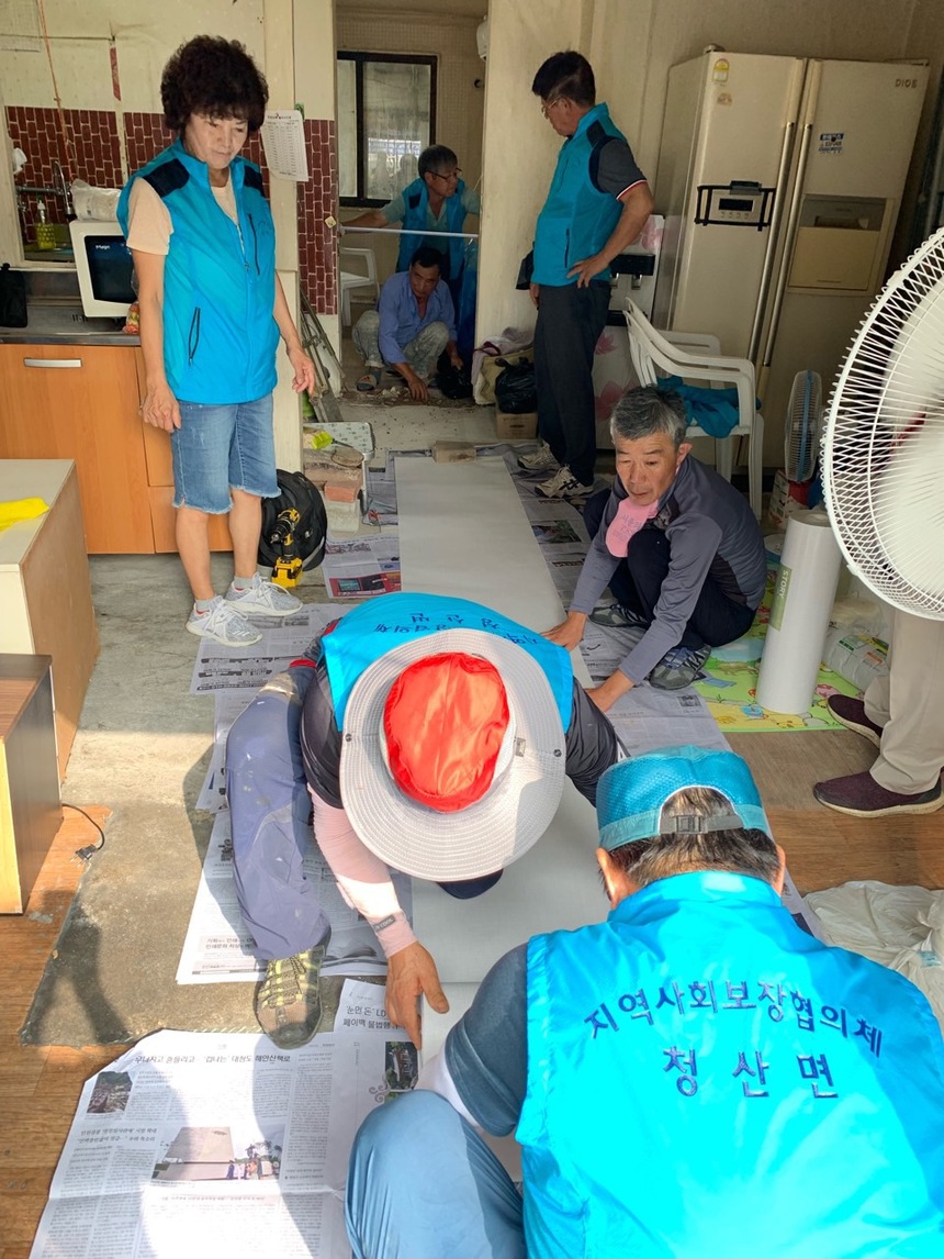 이날 청산사랑나눔회 회원들은 더운 날씨에도 불구하고 낡고 곰팡이가 핀 벽지와 찢어진 장판을 교체하고 집 안팎의 쓰레기 등을 치워 어르신이 좀 더 쾌적한 환경에서 생활하실 수 있도록 구슬땀을 흘렸다.
