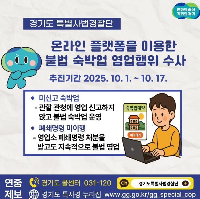 [경기탑뉴스=박봉석 기자] 경기도가 10월 1일부터 17일까지 3주간 온라인 공유 숙박 플랫폼을 이용해 오피스텔 등에서 불법 숙박업을 운영하는 미신고 업소를 집중 단속한다.