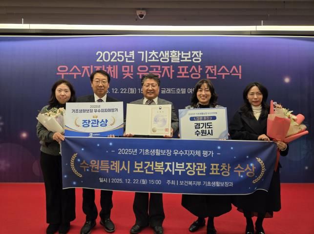 [경기탑뉴스=박봉석 기자] 수원특례시가 보건복지부 주관 ‘2025년 기초생활보장·긴급지원 사업’ 평가에서 우수 지자체로 선정돼 보건복지부 장관 표창을 받았다. 시상식은 22일 서울 글래드호텔에서 열렸다.