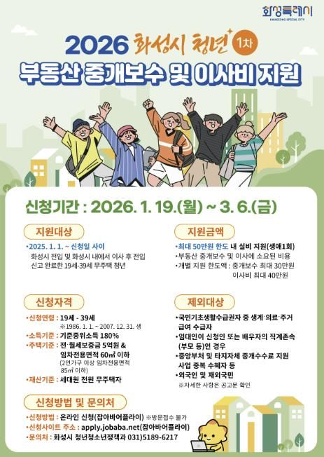 [경기탑뉴스=박봉석 기자] 화성특례시가 19일부터 3월 6일까지 청년들의 주거비 부담 경감 및 정주 여건 향상을 위한 ‘2026년 상반기 청년 부동산 중개보수 및 이사비 지원사업’ 신청을 받는다.