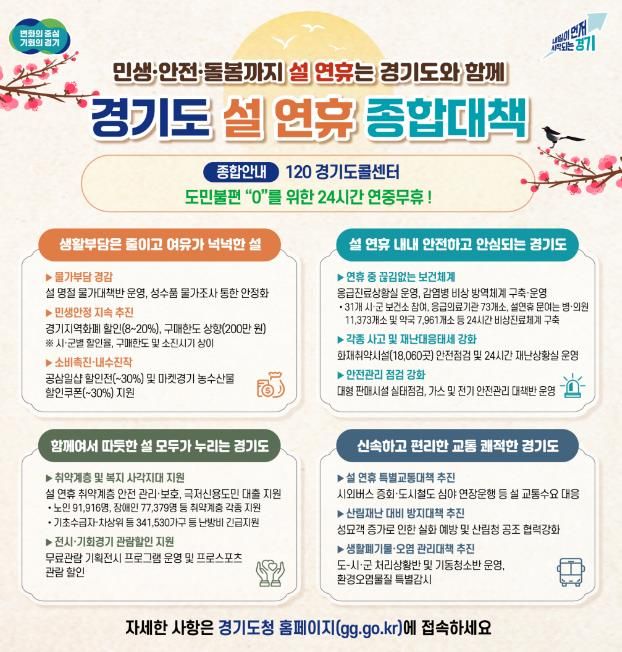 [경기탑뉴스=박봉석 기자] 경기도가 도민들이 따뜻하고 편안한 명절을 보낼 수 있도록 ‘설 연휴 종합대책’을 추진한다.