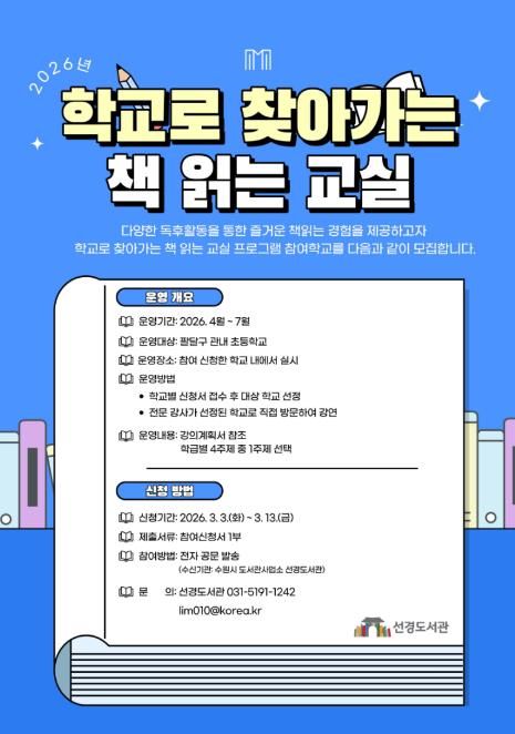 [경기탑뉴스=박봉석 기자] 수원시 선경도서관은 ‘2026년 학교로 찾아가는 책 읽는 교실’에 참여할 팔달구 관내 초등학교를 13일까지 모집한다.
