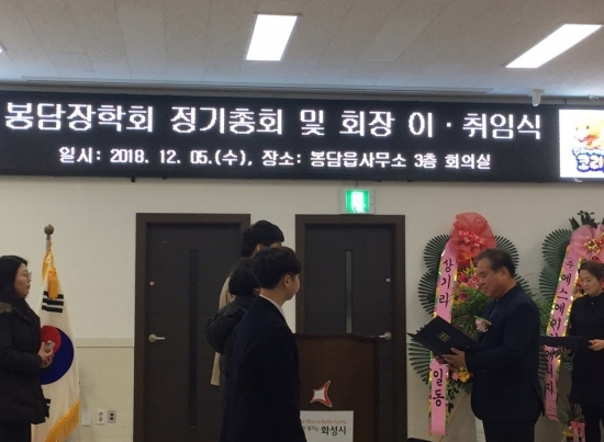 화성시 봉담장학회가 지난 5일 봉담읍사무소에 열린 회장 이·취임식에서 관내 저소득층 청소년 3명에게 각 30만원의 장학금을 전달했다.