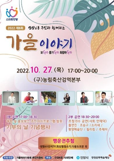 [경기탑뉴스=박봉석 기자] 안양시 안양6동(동장 권민정)에서는 27일 저녁 5시부터 (구)농림축산검역본부 특설무대에서 지역주민과 함께하는 ‘제6회 가을이야기’ 축제를 개최한다.