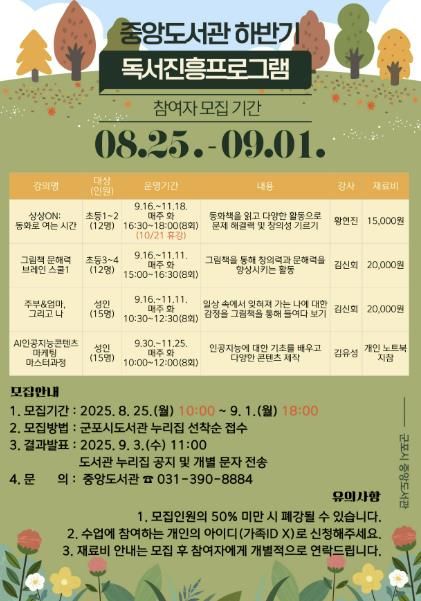 프로그램 참여 신청접수는 8월 25일(월) 오전 10시부터 군포시도서관 누리집을 통해 선착순으로 진행되며, 자세한 내용은 군포시도서관 누리집 공지사항을 참고하거나 중앙도서관팀으로 문의하면 된다.