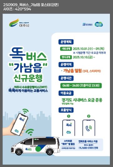 이충우 여주시장은 “이번 가남읍 시범사업은 단순히 똑버스를 추가로 도입하는 것이 아니라, 기존 버스 노선 개편과 연계해 지역 교통체계를 근본적으로 개선하려는 시도”라며 “특히 교통 소외지역까지 촘촘히 연결하는 맞춤형 교통서비스로 시민들의 교통 복지를 강화해 나가겠다”고 밝혔다.