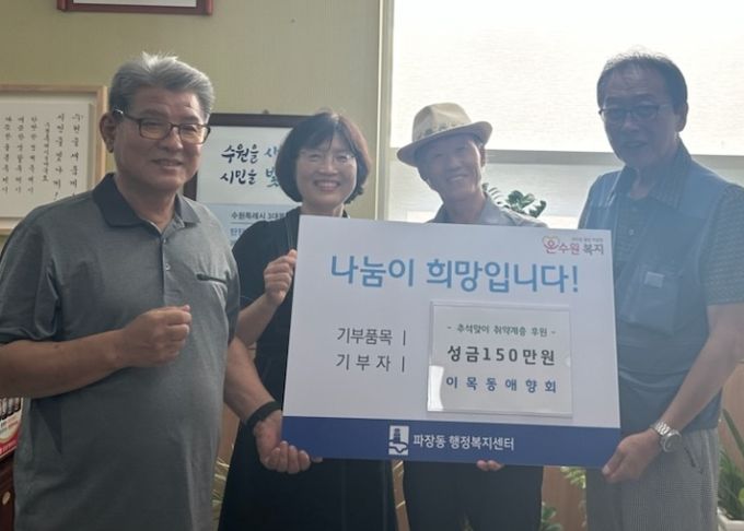 [경기탑뉴스=박봉석 기자] 수원시 장안구 파장동은 지난 18일, 이목동 애향회에서 추석을 맞이하여 홀로 계신 어르신과 저소득 취약계층 등 소외된 이웃들에게 힘이 되고자 성금 150만원을 기부했다고 밝혔다.