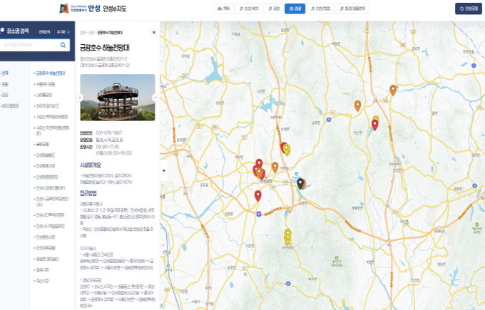 PC나 모바일 웹 브라우저에서 안성시 대표포털에 접속 후 사용이 가능하며, 관심 있는 카테고리(관광지·공공시설·교통 등)를 클릭하면 위치 정보와 더불어 해당 시설의 운영시간·연락처·편의시설 등 상세 정보도 함께 확인할 수 있다.