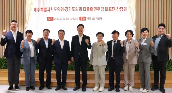 [경기탑뉴스=박봉석 기자] 경기도의회 더불어민주당이 30일 예담채에서 교섭단체 운영현황 공유 및 상호 교류·협력 강화를 위해 경기도의회를 방문한 제주도의회 더불어민주당과 간담회를 진행했다.