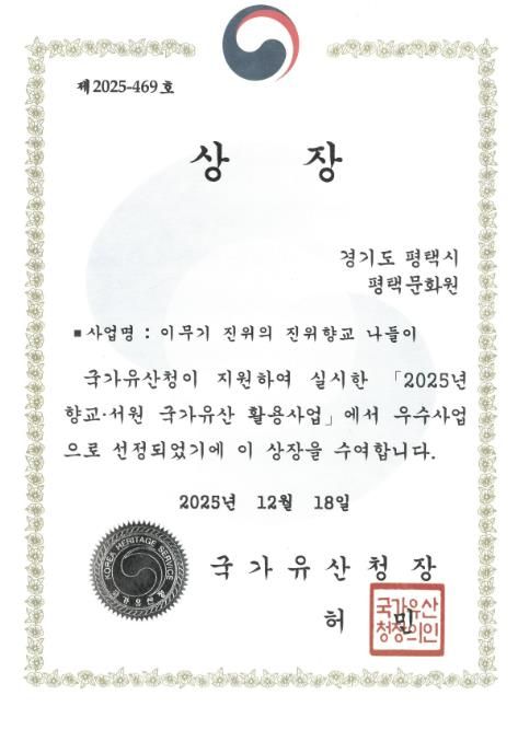 [경기탑뉴스=박봉석 기자] 평택문화원은 12월 18일 대전 전통나래관 다목적강당에서 열린 국가유산청 주최 ‘2025 우리고장 국가유산 활용 우수사업 시상식’에서 평택문화원의 ‘이무기 진위의 진위향교 나들이’가 우수사업(국가유산청장상)으로 수상했다.