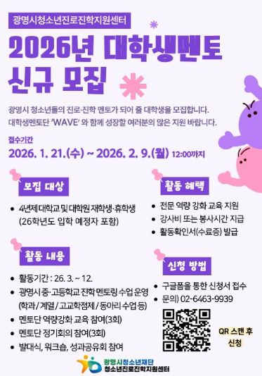 [경기탑뉴스=박봉석 기자] 광명시청소년재단 청소년진로진학지원센터는 관내 중·고등학교 청소년 대상 학과 멘토링 운영을 위해 ‘2026년 대학생 멘토단(wave)’을 모집한다고 밝혔다.