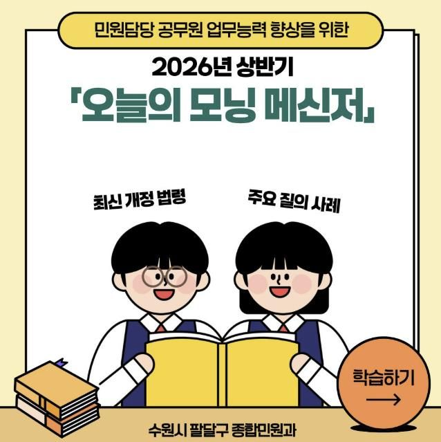 김미라 팔달구 종합민원과장은 “매일 아침 짧은 시간을 투자한 꾸준한 직무 학습이 시민들에게 더욱 정확하고 친절한 행정서비스를 제공하는 밑거름이 될 것”이라며, “앞으로도 직원들의 민원 대응 역량을 강화해 시민이 체감할 수 있는 만족도 높은 구정을 펼쳐 나가겠다”라고 전했다.