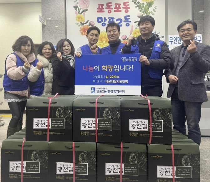 [경기탑뉴스=박봉석 기자] 영통구 망포2동 행정복지센터는 지난 6일 망포2동 바르게살기위원회가 관내 저소득 가정을 지원하기 위해 김 20박스를 기탁했다고 밝혔다.