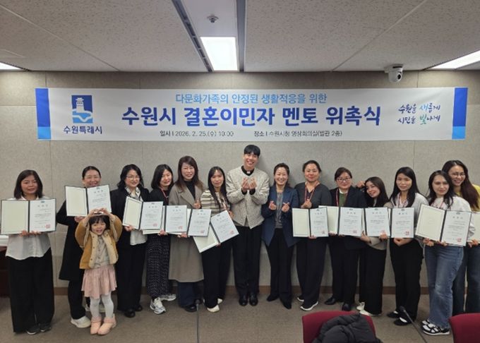 [경기탑뉴스=박봉석 기자] 수원특례시가 25일 시청 영상회의실에서 ‘2026년 결혼이민자 멘토 위촉식’을 열고 선배 이민자 멘토 15명을 위촉했다.