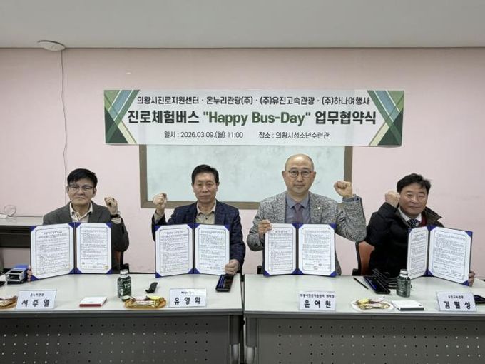 [경기탑뉴스=박봉석 기자] 의왕시청소년재단 산하 의왕시진로지원센터 ‘꿈터’가 청소년들의 진로 탐색을 지원하기 위해 3월 9일 관내 운수업체와 ‘진로체험버스’ 운영을 위한 업무협약(MOU)을 체결했다.