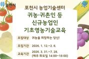 [경기탑뉴스=한진선 기자] 포천시농업기술센터 2026년 포천시 귀농·귀촌인 등 신규농업인 기초영농기술교육’ 교육생을 오는 2월 6일까지 모집한다. 이번 교육은 포천시로 귀농했거나 귀농을 희망하는 신규농업인을 대상으로 농업경영 전반에 대한 이해와 기초 영농기술 교육을 제공해 안정적인 농촌 정착과 전문농업인으로의 성장을 지원하기 위해 마련됐다. 올해 교육 인원은 25명 내외로 운영될 예정이다. 주요 교육 내용은 귀농 정책사업과 영농생활에 필요한 법률, 지속 가능한 농장 디자인 등 농촌생활 분야를 비롯해 토양 관리와 재배 기술, 소규모 시설하우스 조성, 친환경 농자재 제조 및 활용 등 농업기초기술 교육으로 이뤄진다. 또한 우수 농가 및 체류형 귀농마을 현장 견학을 통해 실제 농업 현장을 직접 체험할 수 있도록 할 예정이다. 교육은 3월 31일부터 7월 28일까지 매주 화요일, 총 17회에 걸쳐 진행되며 교육비는 전액 무료다. 특히 이번 교육 과정은 귀농 자금 신청 시 교육 이수 시간으로도 인정돼 교육생들에게 실질적인 도움이 될 것으로 기대된다. 교육생 모집 기간은 2월 6일까지이며, 모집 대상은 포천시에