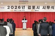 [경기탑뉴스=한진선 기자] 김포시가 2일 오전 10시, 시청 본관 3층 대회의실에서 ‘2026년도 시무식’을 열고 붉은 말 병오년(丙午年) 새해의 힘찬 출발을 알렸다. 이날 시무식에는 김병수 김포시장을 비롯해 실·국·소장, 부서장 등 간부 공직자 100여 명이 참석해 새해 시정 운영 방향을 공유하고, 시민 중심의 시정 추진과 새로운 도약을 향한 결의를 다졌다. 행사는 국민의례를 시작으로 공무원 헌장 낭독, 신년사 순으로 차분하고 엄숙하게 진행됐으며, 참석자들은 시무식을 통해 공직자로서의 사명과 책임을 다시 한 번 되새기는 시간을 가졌다. 김병수 김포시장은 신년사에서 “붉은 말의 해는 뜨거운 열정과 강한 추진력을 상징한다”며 “올해는 이 기운을 받아 ‘시민의 상상이 현실이 되는 김포’를 시민 한 분 한 분이 실제로 느낄 수 있도록 시정 역량을 집중해 나가겠다”고 밝혔다. 아울러 “속도감 있는 행정과 책임 있는 실천으로 김포의 미래 경쟁력을 더욱 높여 나가겠다”고 덧붙였다. 한편, 시무식을 마친 뒤 참석자들은 서로 새해 인사를 나누며 올 한 해 시정 운영에 대한 각오를 공유하는 시간을 가졌으며, 시민과