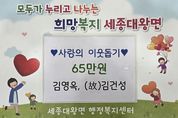 [경기탑뉴스=한진선 기자] 지난 29일 세종대왕면 구양리에 거주하는 김영옥, (故)김건성께서 관내 어려운 이웃을 위한 성금 65만원을 세종대왕면 지역사회보장협의체에 기탁했다. 김영옥, (故)김건성께서는 주변의 저소득 가구를 위해 성금을 기부하여 지역사회에 따뜻한 마음을 전했다. 김영옥님은 “기부한 성금이 소외된 이웃들에게 조금이나마 도움이 되길 바라며 기회가 있을 때마다 지역사회에 도움이 되도록 함께 마음을 나누겠다.”고 전했다. 홍광래 세종대왕면장은 “어려운 이웃을 위해 따뜻한 마음을 전해준 김영옥님에게 감사의 마음을 전하며 기부 해주신 성금은 어려운 이웃을 위해 잘 사용하겠다.”고 전했다.