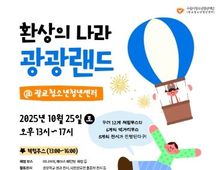 [경기탑뉴스=박봉석 기자] 수원시청소년청년재단(이사장 최종진) 광교청소년청년센터는 오는 10월 25일 오후 1시부터 5시까지, 청소년·청년 및 지역주민을 위한 가을맞이 축제 ‘환상의 나라 '광광(光光)랜드'’행사를 개최한다고 밝혔다. 축제는 ▲체험부스 및 전시(13:00~16:00) ▲문화예술공연(16:00~17:00)으로 구성되며, 온 가족이 함께 참여할 수 있는 다채로운 프로그램을 선보인다. 특히 총 12개의 체험부스와 6개의 먹거리 부스, 3개의 전시가 운영되어 풍성한 즐길거리를 제공한다. 체험부스는 혁신신약 연구원 체험·원목키링 만들기 등 참여형 체험을 중심으로 진행되며, 활동 전시 코너에서는 공유학교 성과 전시와 사진공모전 출품작 전시 등이 마련된다. 먹거리 코너는 초코분수, 파인다이닝 음식 등 이색적인 먹거리가 구성되어있으며, 감성 가득 ‘셀프스튜디오’ 포토존도 상시 운영된다. 문화예술공연(16:00~17:00)은 보컬·방송댄스·마술공연 등으로 이어져 축제의 열기를 더할 예정이다. 참여 방법은 전 연령 무료입장으로 현장 참여가 가능하며, 일부 프로그램은 사전예약 QR코드 확인 후 이용할 수 있다.