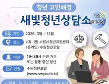 [경기탑뉴스=박봉석 기자] 수원특례시는 12월까지 19~39세 수원 거주 또는 활동 청년을 대상으로 ‘2026 새빛청년상담소’를 운영한다. 법률·노무·세무·부동산 4개 분야 전문가가 청년의 일상 속 고충과 권익 침해 문제를 무료로 상담해 준다. 직장 내 괴롭힘, 임금 체불, 전세 사기, 세금 문제 등 사회진입기 청년이 겪는 현실적인 어려움을 해결할 수 있도록 지원한다. 대면, 온라인 상담을 병행한다. 대면 상담은 수원청년포털에서 예약한 뒤 수원시청년지원센터에서 할 수 있다. 분야별 월 1회 운영하며 1인당 25분간 일대일 상담을 받을 수 있다. 온라인 상담은 수원청년포털 ‘상담 게시판’에 비공개 글로 신청하면 된다. 접수 후 7일 이내에 전문가가 답변한다. 수원시는 3일 수원시청년지원센터에서 상담위원 8명을 위촉했다. 김현수 수원시 제1부시장이 상담위원에게 위촉장을 수여했다. 김현수 제1부시장은 “청년들이 비용 부담 없이 전문가의 도움을 받아 시행착오를 줄이고, 안정적으로 사회에 정착하길 바란다”며 “앞으로도 청년 권익 보호와 실질적인 지원을 강화할 것”이라고 말했다.