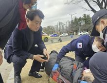[경기탑뉴스=박봉석 기자] 하은호 군포시장이 길에 쓰러진 할머니를 발견하고 신속한 신고와 응급처치를 통해 무사귀환을 도와 화제다 하은호 시장은 27일 오전 10시경 관내 출장길에 산본중앙공원 사거리 KT옆 공원에 쓰러진 할머니를 발견했다. 하 시장 일행은 즉시 차에서 내려 119 신고를 하고 할머니를 편안한 자세로 높혀 상태를 살피며 의식을 잃지 않도록 간호했다. 즉시 출동한 119구조대는 할머니의 의식을 잃지 않도록 주의하며 응급조치를 했고 상태가 호전되어 구급차를 타고 귀가한 것으로 알려졌다. 하은호 시장은 유난히 재난 구조 현장과 가깝다. 고교생이었을 때 안양 일대에 대홍수가 났을 때 대림대학교 앞에서 버스 안으로 물이 차오르는 현장에서 사람들을 구조한 적이 있다. 지난 2022년에는 산본역 피트인 사거리에서 횡단보도 옆에 쓰러진 노인을 발견하고 이번처럼 신속하게 신고와 구조를 통해 무사귀환을 도왔다. 하은호 군포시장은 “해빙기 사고 예방을 위해 직원들과 회의를 마치고 나서는 길이었다”며 “봄이 오는 길목에서 어르신들의 각별한 주의가 필요하다”고 말했다.