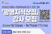 [경기탑뉴스=박봉석 기자] 광명시 평생학습원이 시민 맞춤형 평생학습 프로그램 ‘광명지식상점’을 운영할 2026년도 전문 교육 강사를 공개 모집한다. ‘광명지식상점’은 시민의 삶과 밀접한 주제를 중심으로 배움과 성장을 지원하는 광명시 대표 평생학습 프로그램이다. 2026년에는 ▲미래기술 ▲직무역량 ▲재무설계 ▲인문성찰 ▲관계학습 ▲시민학습 ▲기타 제안과정 등 7개 분야에서 강사를 선발해 시민들에게 다채로운 교육 서비스를 제공할 예정이다. 지원 자격은 해당 모집 분야의 전문성을 보유하고 관련 자격증과 실무경력을 모두 갖춘 자에 한한다. 시는 강의 경력, 강의계획서, 자기소개서 등을 바탕으로 1차 서류심사를 진행한 뒤, 수업 시연과 질의응답으로 구성된 2차 면접심사를 거쳐 최종 40여 명의 강사를 선발할 계획이다. 접수는 오는 12일부터 19일 17시까지 이메일 또는 평생학습원 2층 사무실 방문을 통해 가능하다. 제출 서류 등 세부 사항은 광명시 평생학습플랫폼 ‘광명이(e)지’ 공지사항에서 확인할 수 있다. 최종 합격자는 2월 중 ‘광명e지’에서 발표하며, 선발된 강사진은 3월부터 본격적으로