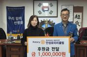 [경기탑뉴스=박봉석 기자] 안성시동부무한돌봄네트워크팀은 지난 26일 국제로타리 3600지구 안성로타리클럽으로부터 촘촘한 복지 안전망 구축을 위한 후원금 100만 원을 전달받았다. 안성로타리클럽은 매년 지역사회를 위한 봉사와 나눔을 실천하며 지역 발전에 기여해 왔으며, 이번 후원금은 복지 사각지대 발굴과 사례관리 대상자에게 전문적인 복지 서비스를 제공하는 데 사용될 예정이다. 안성로타리클럽 이승재 회장은 “현장에서 발로 뛰며 소외된 이웃을 찾는 안성시동부무한돌봄네트워크팀의 활동에 실질적인 도움이 되길 바란다”며 “앞으로도 지역사회의 다양한 사회공헌 프로젝트를 통해 지역 복지 서비스의 질을 높이는 마중물이 되겠다”고 말했다. 안성시동부무한돌봄네트워크팀 정은주 센터장은 “복지 사업을 더욱 안정적이고 원활하게 추진할 수 있도록 도움을 주신 안성로타리클럽에 깊이 감사드린다”며 “지역 주민에게 필요한 맞춤형 복지 서비스를 제공하는 데 최선을 다하겠다”고 말했다