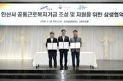 [경기탑뉴스=박봉석 기자] 안산시는 지난 26일 안산상공회의소 그레이트홀에서 경기지방고용노동청 안산지청, 안산시 공동근로복지기금 1호 법인과 함께 ‘안산시 공동근로복지기금 조성 및 지원을 위한 상생협약’을 체결했다고 27일 밝혔다. 이번 협약은 지역 중소기업과 노동자가 함께 참여하는 공동근로복지기금 조성을 통해 대·중소기업 간 복지 격차를 완화하고, 상생과 연대의 노동환경을 조성하기 위해 마련됐다. 앞서 시는 지난해 7월 ‘안산시 공동근로복지기금 지원 조례’를 제정하고, 기초자치단체 최초로 공동근로복지기금 지원사업을 시행했다. 이는 지방정부와 중앙정부, 기금법인이 함께하는 3자 협력 모델을 구축했다는 점에서 의미가 있다. 이날 협약식에는 이민근 안산시장을 비롯해 양승철 경기지방고용노동청 안산지청장과 장현준 기금법인 대표, 참여기업 관계자 등 100여 명이 참석한 가운데 공동근로복지기금 사업 출범을 기념하고 상생 협력 의지를 다졌다. 협약에 따라 안산시는 공동근로복지기금 조성 및 운영을 위한 행정·재정적 지원을 담당하고, 경기지방고용노동청 안산지청은 ▲정책 반영과 제도 개선 ▲참여기업 확대 및 우수사