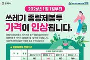 [경기탑뉴스=박봉석 기자] 평택시는 2026년 1월 1일부터 쓰레기 종량제 봉투 가격을 3개년도에 걸쳐 인상한다. 그동안 평택시는 인구증가, 물가상승, 생활 쓰레기 수집 운반 처리비용 증가에도 불구하고 2006년 이후 종량제봉투 가격을 동결해 왔다. 시 관계자는 “현재 평택시의 종량제 가격은 경기도 31개 시군 가운데 최하위 수준이며, 청소예산 재정자립도와 주민부담률이 낮아 가격 인상은 불가피하다”고 밝혔다. 따라서, 대표적으로 일반용 종량제봉투 20리터는 현재 500원에서 110원 인상된 610원으로, 음식물 전용 봉투 1.5리터는 현재 40원에서 20원이 인상된 60원으로, 공동주택에 설치된 음식물종량제기기(RFID)는 1㎏ 단위로 현재 48원에서 12원 인상된 60원으로, 경기도 내 31개 시군 평균 가격을 반영하여 인상안을 마련했다. 다만, 서민경제의 어려움과 시민부담을 고려하여 가격 인상은 3개년도에 걸쳐 단계적으로 시행할 예정으로, 시 관계자는 “종량제봉투 가격 인상에 대한 시민 여러분의 많은 이해와 협조를 부탁드린다”며 “앞으로도 쾌적하고 청결한 도시환경 조성은 물론 질 높은 청소행정