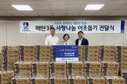 [경기탑뉴스=박봉석 기자] 수원시 영통구 매탄3동행정복지센터는 지난 22일, 추석 명절을 맞이하여 매탄중심상가 상인회에서 후원한 컵라면 200박스 전달식을 가졌다. 매탄중심상가 상인회는 매년 명절마다 지역의 취약계층을 위한 물품을 꾸준히 지원해오고 있다. 후원 물품은 매탄3동 내 복지 사각지대 위기가구 및 기초수급자 등 어려운 이웃 200가구에 전달될 예정이다. 정희경 상인회장은 "추석 명절을 맞아 지역 사회에 조금이나마 도움이 되고자 이번 후원을 결정했다. 매탄3동의 많은 이웃들이 이 컵라면을 통해 따뜻한 식사와 함께 명절의 기쁨을 나눌 수 있기를 바란다”고 말했다. 김병목 매탄3동장은 "매년 꾸준히 이웃을 돕는 매탄중심상가상인회 회원들에게 다시 한 번 감사의 인사를 드린다. 후원물품이 필요한 분들이 따뜻한 명절을 보낼 수 있도록 신속히 전달하겠다”고 전했다.