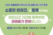[경기탑뉴스=박봉석 기자] 수원시가 동물의 유실·유기를 방지하기 위해 10월 31일까지 ‘동물등록 자진신고 기간’을 운영한다. 자진신고 기간에 동물등록을 하지 않은 시민이 동물을 등록하거나, 소유자 변경 등 동물등록 변경 신고로 동물등록 정보를 현행화하면 과태료가 면제된다. 등록 대상은 월령 2개월 이상의 개다. 소유자가 원하면 고양이도 등록할 수 있다. 동물등록 방법은 동물등록대행 동물병원을 방문해 반려동물에 내장칩을 주사하는 내장형 방식과 외장형 장치를 구입해 부착하는 외장형 방식이 있다. 두 방법 중 한 가지를 선택해 동물등록 신청서를 동물등록대행 동물병원에 제출하면 된다. 동물등록대행 동물병원 현황은 국가동물보호정보시스템에서 확인할 수 있다. 등록 후 소유자 정보, 주소, 연락처 등 변경 사항이 생기면 각 구청 경제교통과 산업팀(방문)이나 정부24·국가동물보호정보시스템에서 신고하면 된다. 동물을 등록하면 잃어버린 반려동물을 찾을 때 도움이 된다. 주인을 잃은 반려동물을 동물보호센터 등 동물보호기관에서 보호하면 기관에서 국가동물보호정보시스템의 동물등록정보를 확인해 소유