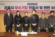 [경기탑뉴스=박봉석 기자] 군포시는 17일 시청 3층 중회의실에서 ‘2025년 군포시 우수기업 인증서 및 현판 수여식’을 열고 5개 우수기업에 인증서와 현판을 수여했다. ‘우수기업 선정사업’은 2022년부터 시작하여 올해 4번째로 추진하는 사업으로 일자리 창출, 세수 증대 등 지역경제 활성화에 기여한 기업을 선정하여 인센티브를 부여하는 사업이다. 선정된 우수기업은 인증기간(3년) 동안 군포시 중소기업 육성자금 지원 시 추가 이차보전, 군포시 관내 공영주차장 이용 시 주차요금 감면, 협약병원 의료비 지원 등의 인센티브가 부여된다. 하은호 군포시장은 “어려운 경제 상황 속 관내 우수한 기업에 활력을 불어넣기 위한 우수기업 선정사업에 관심 가져주심에 감사드리며, 앞으로도 기업지원 사업을 다각화하여 기업 경영하기 좋은 환경을 만들겠다”고 말했다. 올해 선정된 군포시 우수기업은 △(주)아이씨에이치 △㈜지비티코리아 △주식회사예선테크 △듀라텍 주식회사 △㈜트리플닷 으로 총 5개 기업이다.