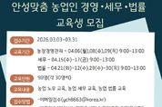 [경기탑뉴스=박봉석 기자] 안성시농업기술센터가 지역 농업인의 안정적인 영농 활동을 돕기 위해 오는 31일까지 ‘안성맞춤 농업인 경영·세무·법률 교육’ 교육생을 모집한다. 이번 교육은 전문가 특강을 통해 농가 운영 중 발생할 수 있는 경영적, 법적 문제를 사전에 예방하고 해결할 수 있는 역량을 키워주기 위해 마련됐다. 교육은 오는 4월 6일부터 30일까지 주제별 지정된 날짜에 진행된다. 모집 분야는 ▲농업 경영 ▲농업 세무 ▲농업 법률 등 3개 과정이며, 분야별로 30명씩 총 90명을 선발한다. 신청 인원이 초과할 경우 내부 선발 기준에 따라 교육생을 최종 선정할 예정이다. 신청 자격은 농업 경영에 관심 있는 안성시민이라면 누구나 가능하며, 접수는 3월 31일까지다. 참여를 희망하는 시민은 이메일을 보내거나 농업기술센터 농업지도과(보개원삼로 219)를 방문해 신청하면 된다. 시 관계자는 “농업인의 눈높이에 맞춘 경영·법률·세무 전문가 특강이 농가 역량을 강화하는 좋은 기회가 될 것”이라며, “안성 농업의 내실을 다지고 싶은 시민 여러분의 많은 관심과 참여를 바란다”고 말했다.