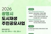 [경기탑뉴스=박봉석 기자] 광명시가 오는 20일까지 주민이 스스로 마을 문제를 해결하고 공동체 활성화를 이끌어갈 ‘2026년 도시재생 주민공모사업’ 참여단체를 모집한다. 이번 공모사업은 광명시 전역을 대상으로 하는 ‘그린라이트 광명 주민공모사업’과 광명3동 더드림 도시재생활성화지역을 대상으로 하는 ‘광명3동 더드림 주민공모사업’ 두 가지 유형으로 운영한다. ‘그린라이트 광명 주민공모사업’은 일반공모 2팀과 기획공모 1팀을 선정해 공동체 활성화, 탄소중립 프로그램 운영, 소규모 도시공간 개선 등 주민 아이디어를 사업으로 발전시키는 활동을 지원한다. 일반공모팀은 팀당 최대 500만 원, 기획공모팀은 팀당 최대 1천만 원을 지원한다. ‘광명3동 더드림 주민공모사업’은 광명3동 도시재생 활성화지역의 마을 문제 해결과 공동체 협력 프로그램 등을 주제로 공모를 진행한다. 4팀을 선정하며 팀당 최대 500만 원을 지원한다. 시는 주민공모사업 이해를 돕기 위해 오는 12일 오후 3시 광명3동 어울리기 문화발전소(광명동 126-31)에서 사업설명회를 개최한다. 또한 사업 성과 확산을 위해