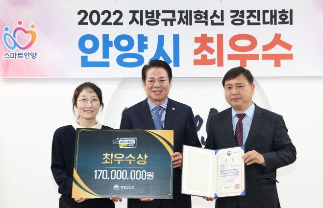 안양시는 11일 부산 벡스코에서 열린 행정안전부 주관 지방규제혁신 우수사례 경진대회에서 최우수상 수상과 함께 1억7000만 원의 재정 인센티브를 받았다고 14일 밝혔다.