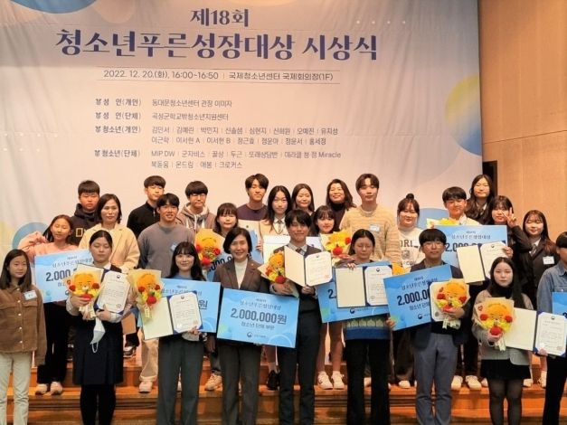 청소년의 건강한 성장에 기여한 공로자를 격려하기 위해 여성가족부 주최로 열린 ‘제18회 청소년푸른성장대상’에서 석수청소년문화의집 방과후아카데미 동아리 ‘미라클 청ㆍ정 Miracle(기적)’과 평촌청소년문화의집 청소년운영위원회 ‘꿈틀’ 이근학 위원장은 각각 청소년 동아리 및 개인 부문에서 여성가족부 장관상을 수상했다.