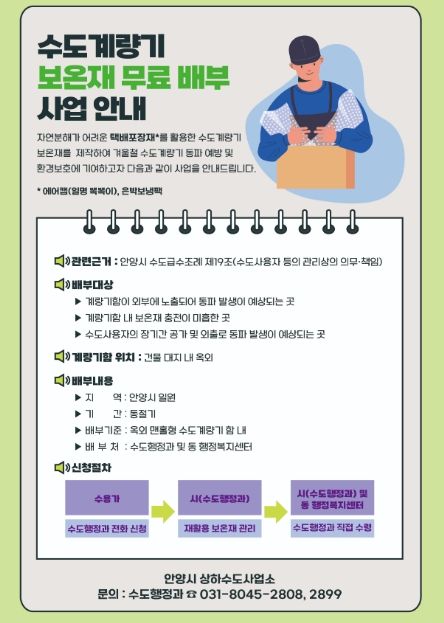 안양시는 ‘택배포장재를 활용한 수도계량기 동파 예방 시범사업(수도계량기 동파 예방사업)’을 추진한다고 5일 밝혔다.