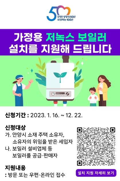 최대호 안양시장은 “난방비 급증으로 어려운 때에 대기환경오염 개선은 물론 난방비도 줄일 수 있는 이번 사업을 적극 활용하길 바란다 ”며 “앞으로도 환경 개선뿐 아니라 시민 생활에 밀접하고 도움이 되는 사업을 적극 추진하겠다”고 말했다.