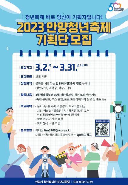 [경기탑뉴스=박봉석 기자] 안양시는 축제의 기획부터 개최까지 청년들이 직접 참여하는‘2023년 안양청년축제기획단’을 모집한다고 17일 밝혔다.