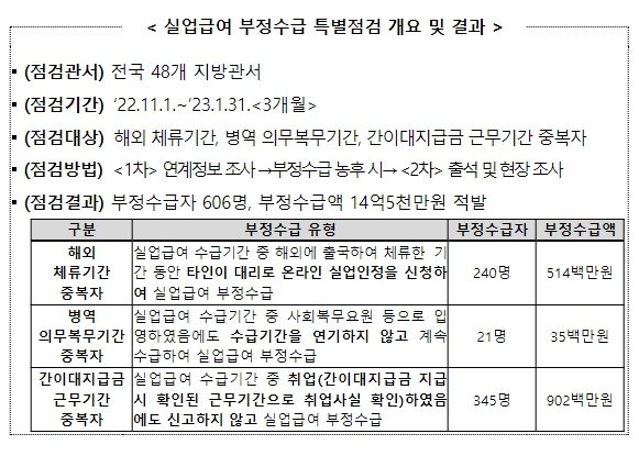 처음으로 실시한 병역 의무복무기간 중복자는 점검 결과, 부정수급자 21명, 부정수급액 3천만원이 적발되어 부정수급이 적은 것으로 확인되지만, 간이대지급금 지급할 때 확인된 근무 기간과 중복자는 점검 결과, 부정수급자 345명, 부정수급액 9억원이 적발되어 부정수급이 다수 확인됐다.